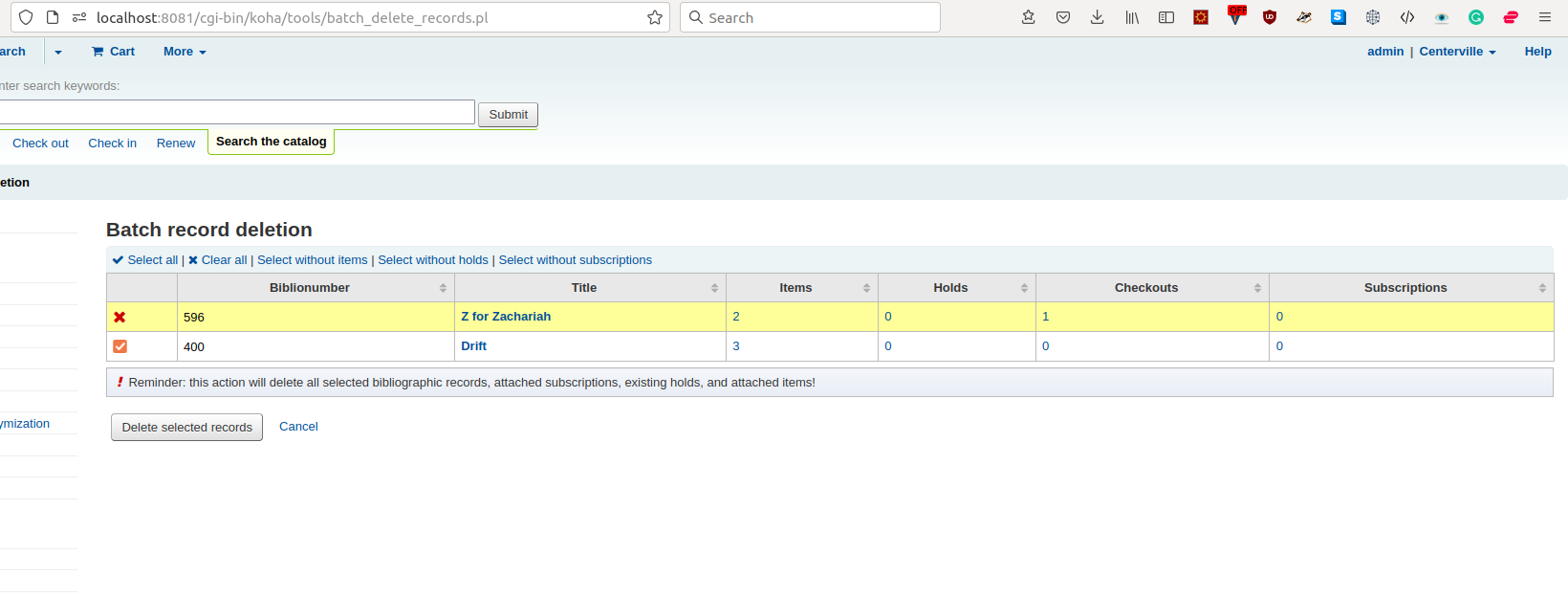 This enhancement more clearly emphasises records that cannot be modified or deleted in the 'Batch record deletion', 'Batch item modification', and 'Batch item deletion' tools. Rows are now highlighted in yellow, with a red 'X' in the first column (hovering over the red 'X' shows the reason it cannot be modified or deleted).