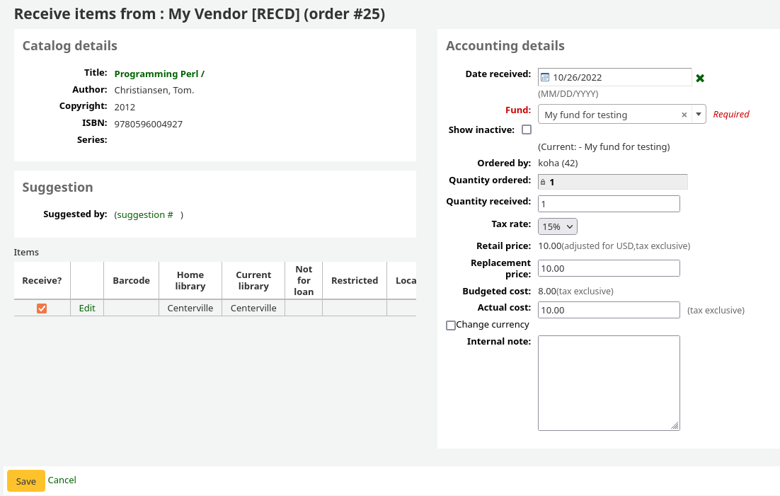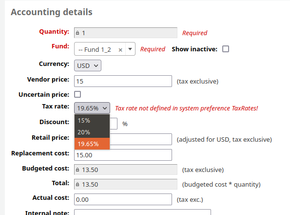 This enhancement adds a note to the TaxRates system preference about updating vendors tax rates when the TaxRates system preference values are changed or removed. (Vendors retain the original value entered, and this is used to calculate the tax rate for orders.)