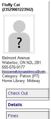 ---- Reported by bchurch@ptfs.com 2009-05-25 14:32:53 ---- Created an attachment Long email address display issye The email address which displays on the left in the various patron windows in the staff client is cut off if it is too long. If possible, the email address should wrap if too long to fit. Attached is a screen print illustrating this display issue. ---- Additional Comments From henridamien@koha-fr.org 2009-05-25 15:32:47 ---- could be wrapped in a clickable icon with alternate text: email could it not ? ---- Additional Comments From gmcharlt@gmail.com 2009-05-26 14:04:30 ---- Marking as template bug and assigning to Owen. Henri's proposal is one idea, another would be to shorten address if need be and put the entire address in a title tag, e.g., real...@yahoo.com ---- Additional Comments From oleonard@myacpl.org 2009-08-12 17:14:43 ---- Created an attachment Proposed fix ---- Additional Comments From oleonard@myacpl.org 2009-08-12 17:15:38 ---- Created an attachment Display after proposed fix ---- Additional Comments From gmcharlt@gmail.com 2009-08-13 01:23:00 ---- Patch pushed to HEAD. <nit>Would be nice if the ellipsis were shown only if the address overflows</nit> ---- Additional Comments From nengard@gmail.com 2009-12-17 01:53:11 ---- ellipsis still shows on short email addresses -but since it's just a <nit> marking bug as fixed --- Bug imported by chris@bigballofwax.co.nz 2010-05-21 01:08 UTC --- This bug was previously known as _bug_ 3256 at http://bugs.koha.org/cgi-bin/bugzilla3/show_bug.cgi?id=3256 Imported an attachment (id=1181) Imported an attachment (id=1182) Imported an attachment (id=1183) Actual time not defined. Setting to 0.0 The original reporter of this bug does not have an account here. Reassigning to the person who moved it here: chris@bigballofwax.co.nz. Previous reporter was bchurch@ptfs.com. The original submitter of attachment 1181 [details] is unknown. Reassigning to the person who moved it here: chris@bigballofwax.co.nz. The original submitter of attachment 1182 [details] [review] is unknown. Reassigning to the person who moved it here: chris@bigballofwax.co.nz. The original submitter of attachment 1183 [details] is unknown. Reassigning to the person who moved it here: chris@bigballofwax.co.nz.