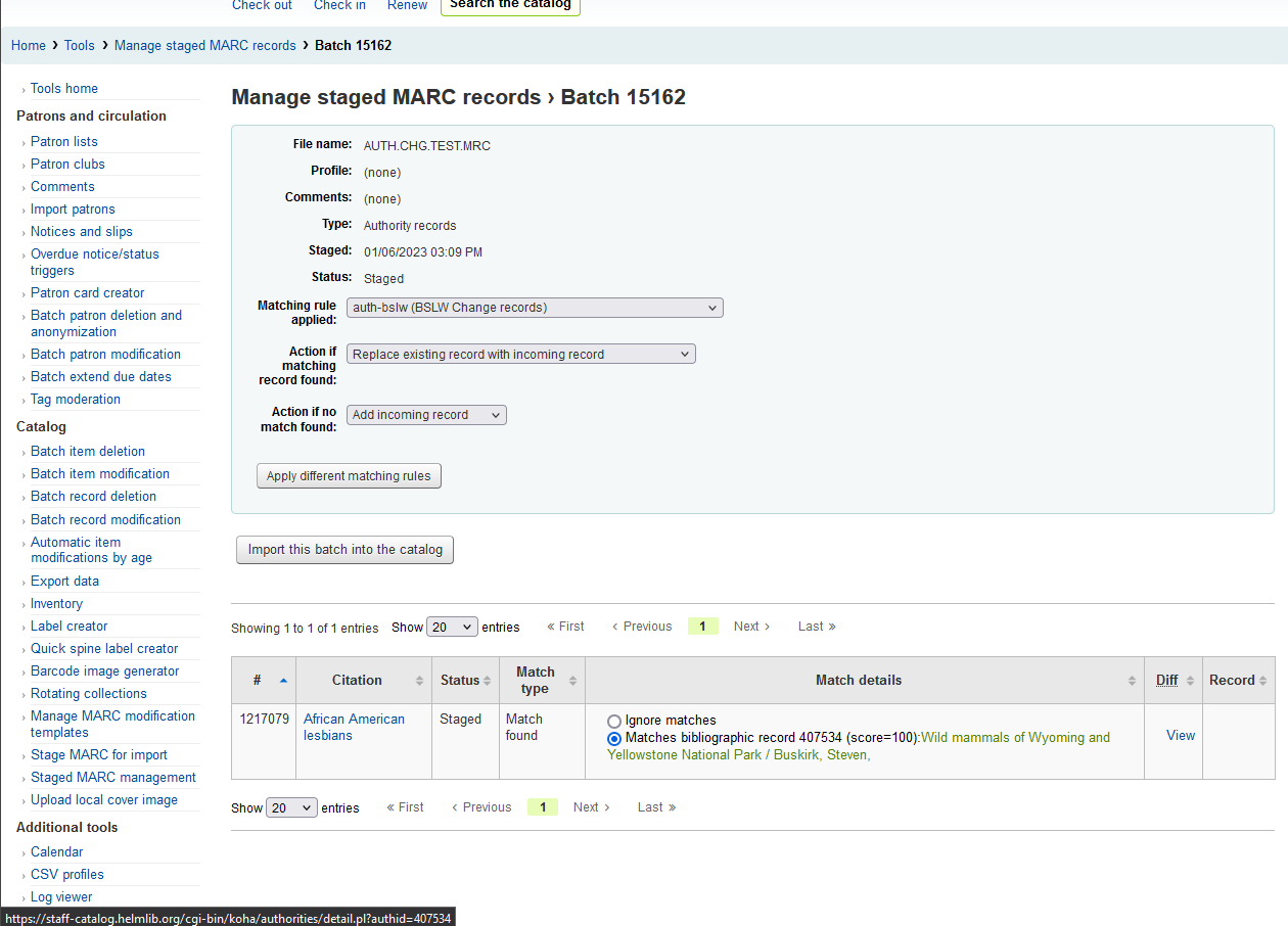 Created attachment 145105 [details] screenshot of authority being staged. text is from biblionumber 407534, but link correctly goes to authid 407534. When importing a set of authorities, if a match is found, the match details will say "Matches bibliographic record xxyy (score:) (Title and author from bib)" where xxyy is the id of the matching authority record. The record being linked to is the matching authority, not the bib. When viewing diffs, the records being compared are correct (incoming authority record and existing authority record are compared), and if imported, the correct authority record is updated while the bib remains untouched. This seems to just be a display bug where the match details text pulls in the biblio data regardless of import record type.