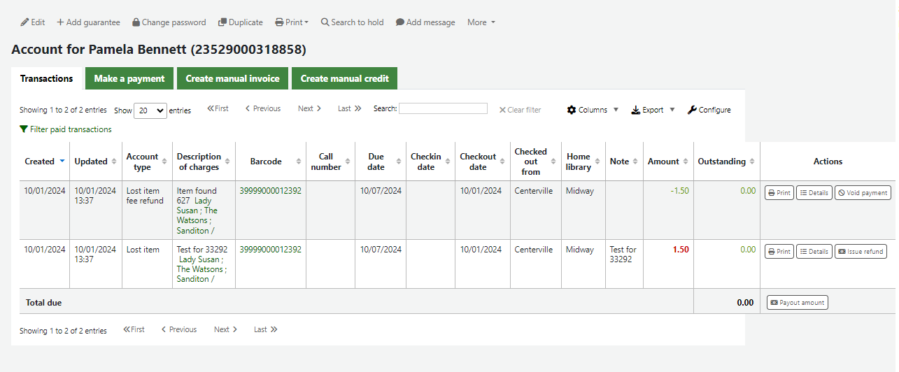 Test plan: 1) In KTD, set ClaimReturnedLostValue to any value -- I Used 'Lost' 2) Checkout an item to a patron -- I used 39999000012392 3) Add a manual invoice to that patron's account against that item barcode I used patron with card number 23529000318858 and added a 1.50 charge. 4) In the patron's checkouts table, click the Claim returned button 5) The checkbox will have the option to "Refund previous lost fee" 6) Tick this box and submit 7) Have a look at the patron's transactions. There will now be a new line refunding the lost fee from step 3 This all worked as expected. Screenshots of the "refund previous lost fee" popup and the account lines will be attached.