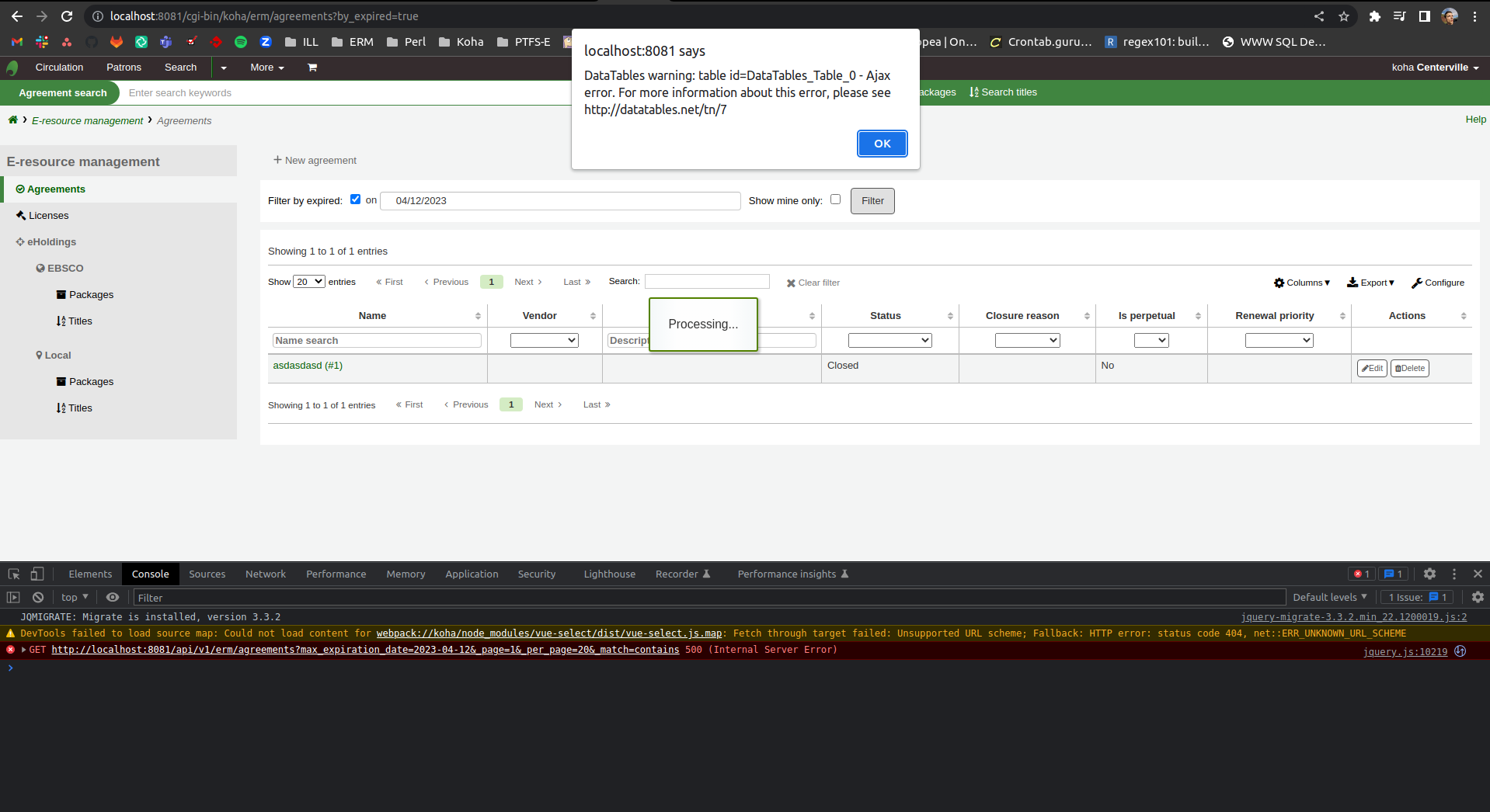 [ERROR] GET /api/v1/erm/agreements: unhandled exception (DBIx::Class::Exception)<<DBIx::Class::Storage::DBI::_dbh_execute(): DBI Exception: DBD::mysql::st execute failed: Column 'agreement_id' in where clause is ambiguous at /kohadevbox/koha/Koha/Objects.pm line 394