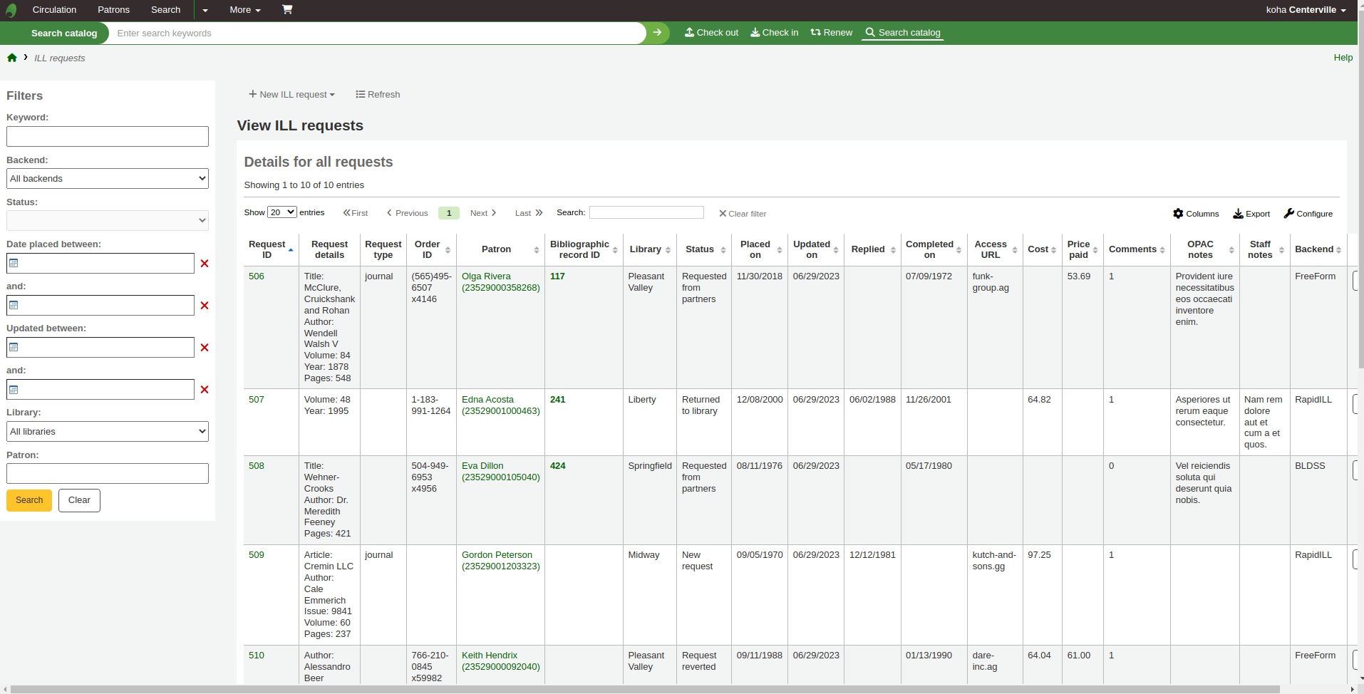 I had a go at testing, however I think with some of the changes in train for ILL that this may need some more work? I tested with the ILL FreeForm backend, with the 24.05.x branch. However, after the patch the list of ILL requests does not actually list the requests - you get the table headings, but no details and a JavScript error (when using the developer tools): Uncaught SyntaxError: Unexpected token ':' (at ill-list-table_24.0600000.js:246:23) No metadata enrichment plugins found. ill-batch-modal_24.0600000.js:4 Draft test plan: 1. Enable the ILL module and an ILL backend: . bash <(curl -s https://raw.githubusercontent.com/ammopt/koha-ill-dev/master/start-ill-dev.sh) . change to the FreeForm directory: cd Koha/Illbackends/FreeForm . checkout the 24.05.x branch: git checkout 24.05.x 2. Create an ILL request (any type is fine, Journal article recommended) 3. List all ILL requests - note that table goes off the page to the right). 4. Apply the patch and restart everything. 5. Duplicate the tab (so that you can compare the table layout) and refresh the page. 6. Notice that: . the title details (columns for author, title, article title, issue, volume, year, pages) are now in one column, Request details . there is a Batch column (?) . to edit the request, click on XXX . the table no longer overflows 7. Sign off D: