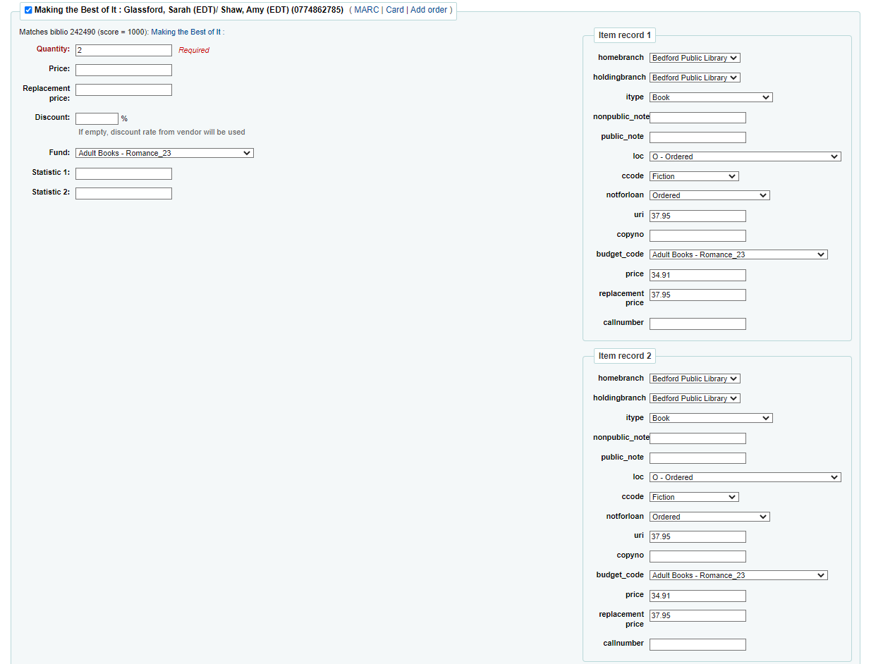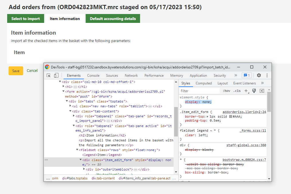 The display is much better now. Here are several things to take a look at: The three action buttons for the items are sitting right on top of a thin border line. Some space between the buttons would look better. Or, is the line needed at all? Since the item labels are of different widths it makes the input boxes display in a staggered fashion. It would be easier to view if the labels were all one width so that the input boxes could align. It was that way for me in 22.05 but it's possible I put some code in place to do that. If there is no match for the bib then 'Match:' is just hanging above the order info with no purpose. It did not display at all in 22.05 if there was no match. When clicking on the 'Item information' tab the edit_item_form does not display. I've attached a few screenshots.