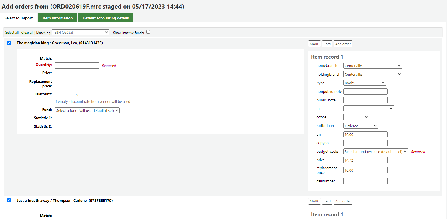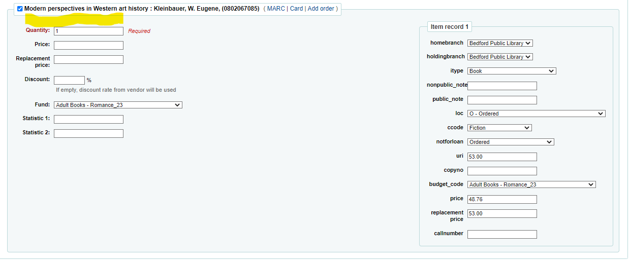 Created attachment 151315 [details] [review] Bug 33748: Fix UI issue when importing records from a staged MARC file To test: 1. Set MarcItemFieldsToOrder like this: homebranch: 975$a holdingbranch: 975$b itype: 975$y nonpublic_note: 975$x public_note: 975$z loc: 975$c ccode: 975$8 notforloan: 975$7 quantity: 975$q price: 975$g replacementprice: 975$v uri: 975$u 2. Set MarcFieldsToOrder like this: price: 975$p quantity: 975$q budget_code: 975$h 3. Stage a MARC file that has bibs with items. 4. From acquisitions create a new basket and add 'From a staged file' 5. APPLY PATCH 6. Try 3 - 4 again, the display should now look correct.