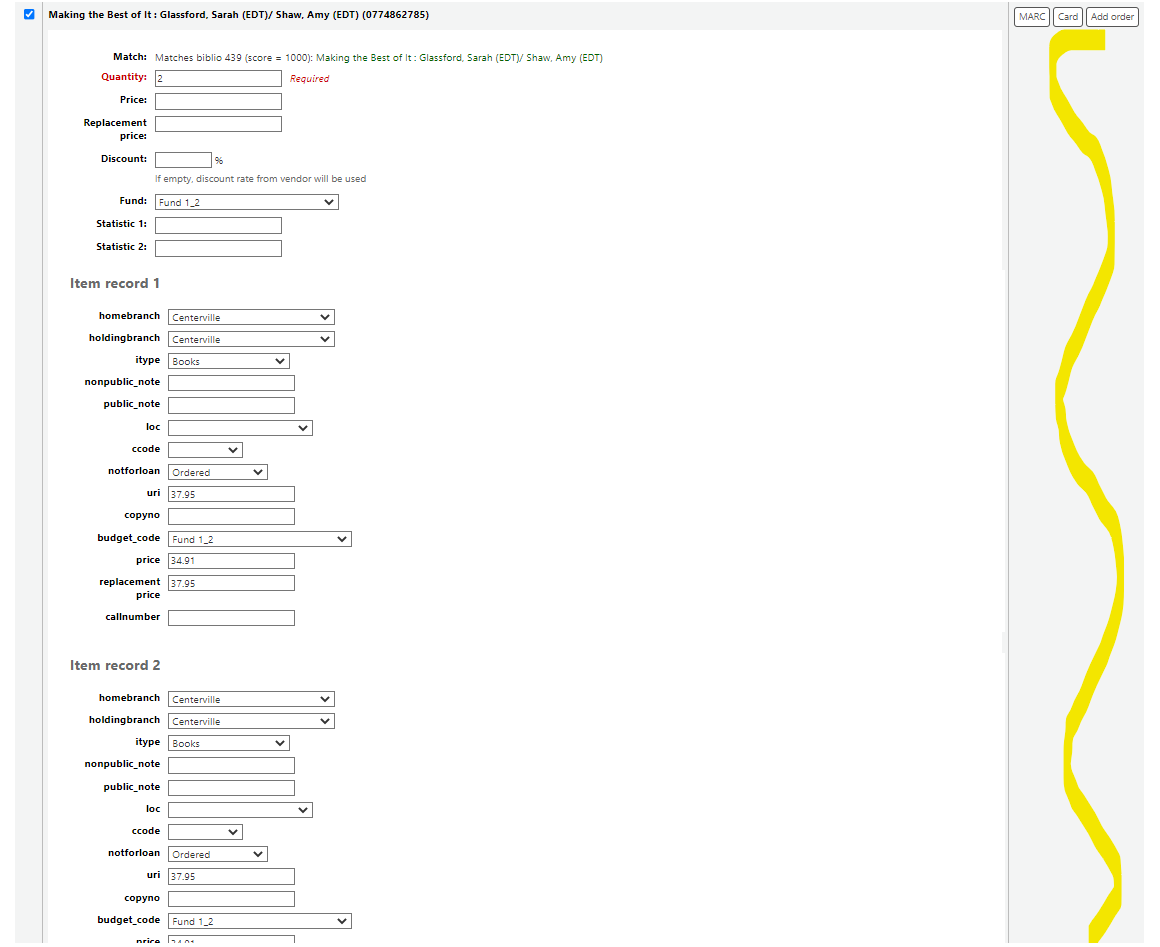 Created attachment 151714 [details] [review] Bug 33748: Fix UI issue when importing records from a staged MARC file This patch attempts to fix a UI issue on addorderiso2709.tt. It removes the <td> which contains the actoin buttons MARC, Card, and Add Order and adds them to the title line. This is so there is more space for the fieldsets. 1. Apply patch 2. Set MarcItemFieldsToOrder like this: homebranch: 975$a holdingbranch: 975$b itype: 975$y nonpublic_note: 975$x public_note: 975$z loc: 975$c ccode: 975$8 notforloan: 975$7 quantity: 975$q price: 975$g replacementprice: 975$v uri: 975$u 3. Stage a MARC file where the bibs have items attached 4. From acquisitions create a new basket and add 'From a staged file'. 5. Add the staged files to a basket. 6. Make sure the display looks correct. 7. Expand the data by clicking on the checkbox on the left hand side, or by clicking 'Select all'. 8. Make sure the display looks correct. 9. Tab over to 'Item informtion' and make sure that display looks correct. 10. Shrink the screen size down to less that 992px, ensuring the display remains correct. Signed-off-by: Barbara Johnson <barbara.johnson@bedfordtx.gov>