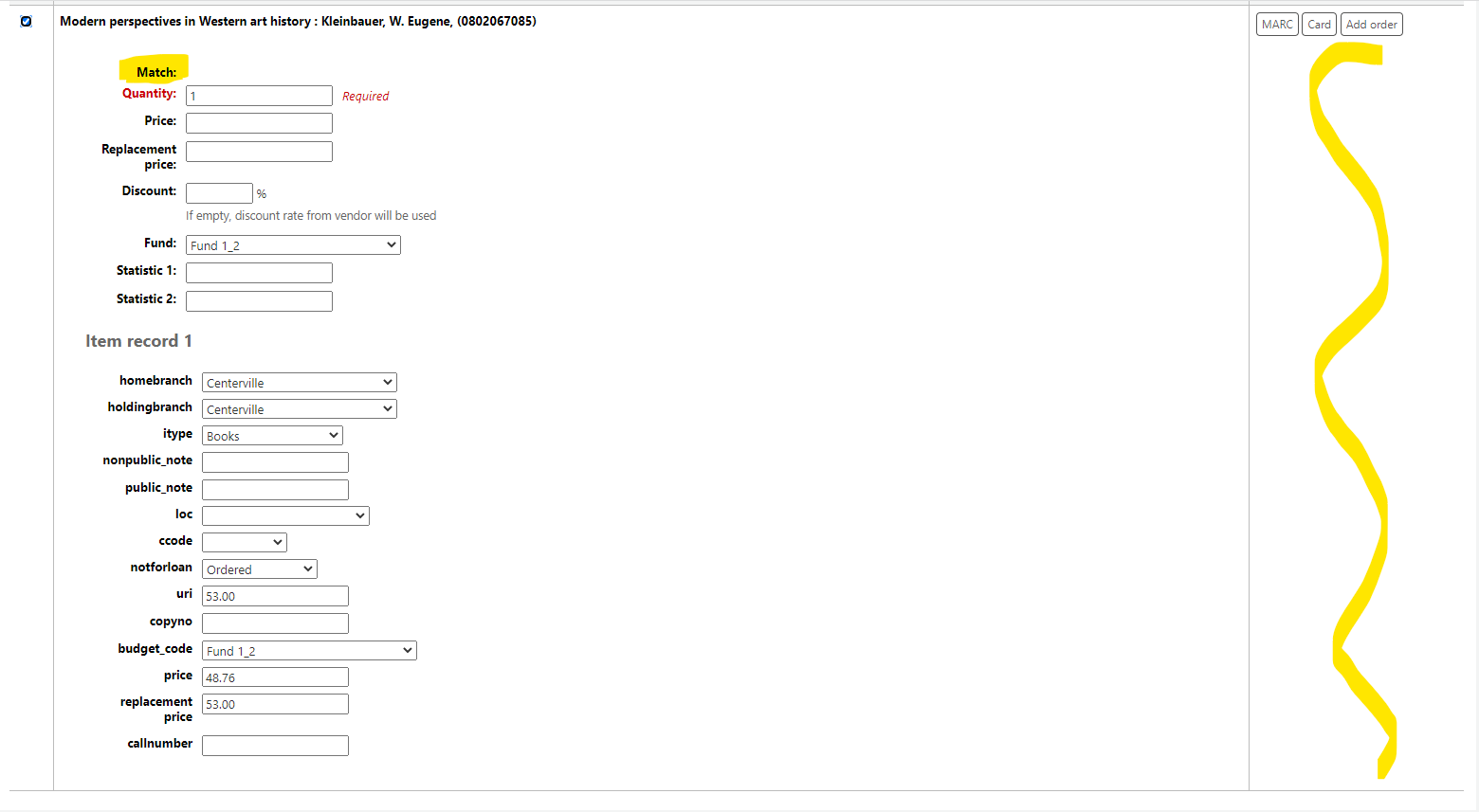 How I recreated: 1. Set MarcItemFieldsToOrder like this: homebranch: 975$a holdingbranch: 975$b itype: 975$y nonpublic_note: 975$x public_note: 975$z loc: 975$c ccode: 975$8 notforloan: 975$7 quantity: 975$q price: 975$g replacementprice: 975$v uri: 975$u 2. Set MarcFieldsToOrder like this: price: 975$p quantity: 975$q budget_code: 975$h 3. Stage a MARC file that has bibs with items. 4. From acquisitions create a new basket and add 'From a staged file' Notices that the Item record X info is pushed to the left and the 'Match' label has a border running right through it.