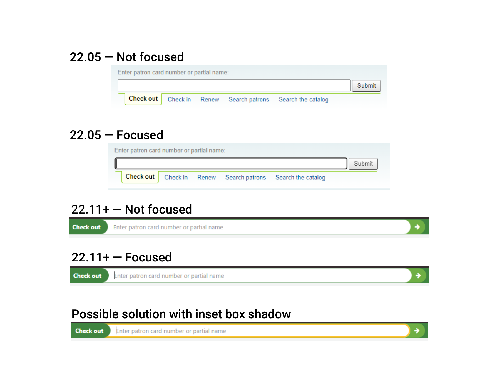 Created attachment 151435 [details] Comparison of header search pre and post 22.11 Prior to the staff interface redesign, the input box in the header search had a black outline to indicate focus. This no longer appears post-redesign so it is easy to miss when the input is in or out of focus. This is also an accessibility concern: https://developer.mozilla.org/en-US/docs/Web/CSS/:focus#accessibility_concerns A possible workaround is to add an inset box-shadow: #header_search .form-content:focus-within { box-shadow: inset 0 0 0px 3px #ffc32b; } The attachment includes the before and after, as well as how the above css looks.
