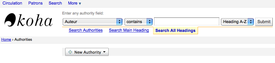 ---- Reported by frederic@tamil.fr 2009-07-02 16:52:22 ---- Created an attachment Authority Search Bar When an authority search is done on all headings, Zebra index 1=Any is not choose, but Heading-Main. So it's not possible to find authorities on authorities related fields. --- Bug imported by chris@bigballofwax.co.nz 2010-05-21 01:09 UTC --- This bug was previously known as _bug_ 3386 at http://bugs.koha.org/cgi-bin/bugzilla3/show_bug.cgi?id=3386 Imported an attachment (id=1270) Actual time not defined. Setting to 0.0 The original submitter of attachment 1270 [details] is unknown. Reassigning to the person who moved it here: chris@bigballofwax.co.nz.