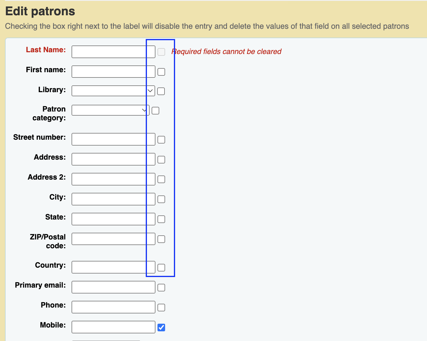 Created attachment 152920 [details] 22.05 Batch Patron Modification Tool with Checkboxes When using the batch patron modification tool in 22.05, you could select one of the boxes to the right of the field to clear the value. The instructions for this feature are in 22.11, but the checkboxes and functionality is missing. See attached screenshots for examples.