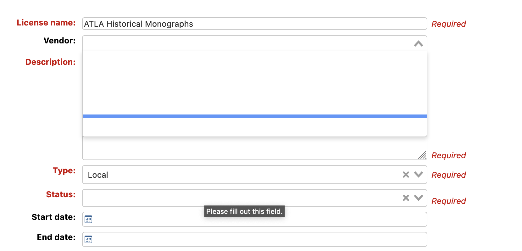 Created attachment 153823 [details] the page of vendor list in ERM After creating a new agreement or license, the vendor list shows blank. A list of vendors has been create in the acquisition module before. The vendor list is visble in the ERM license and agreement filter.