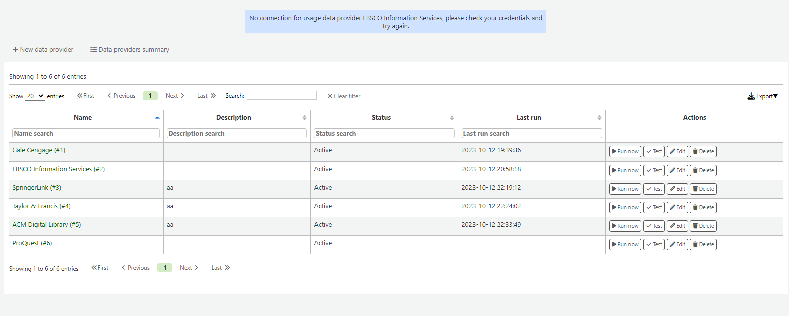 This feature adds the ability to create Data Providers and harvest usage data in COUNTER format. Data Providers (or Data Platforms) are the organisations who provide usage statistics for your electronic resources. This could be a vendor or a platform provider. The data provider record contains information about SUSHI credentials and any COUNTER data which has been harvested from the provider. There is also the ability to create custom reports using this COUNTER data.