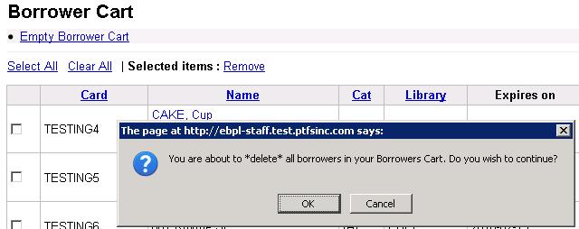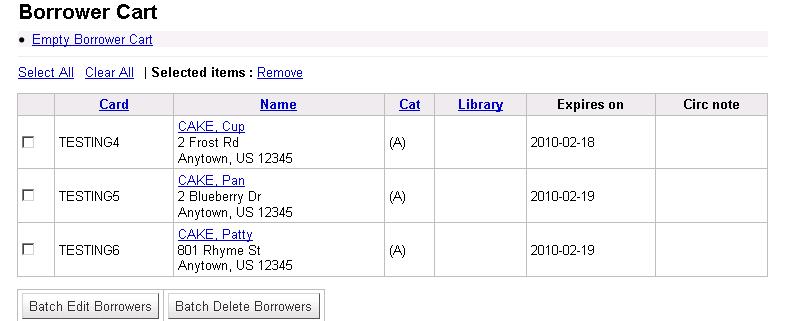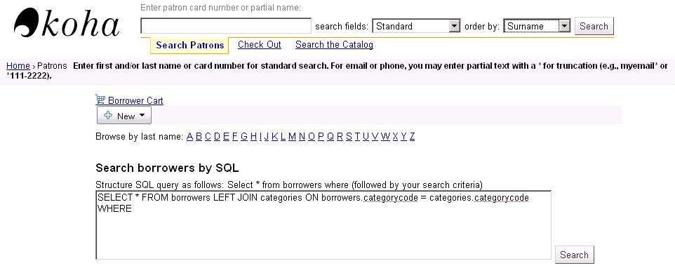 ---- Reported by jwagner@ptfs.com 2009-08-02 15:25:27 ---- Created an attachment Search screenshot Sponsored by East Brunswick Public Library, East Brunswick, NJ, USA. Enhance patron search by adding options to allow partial searches of email and phone, and a direct SQL query in the bottom box. (Per discussion on the listserv and IRC, display of the SQL query will be controlled by a syspref. However, it is read-only and only brings results up into the standard patron search hitlist.) Add borrower cart function to collect selected patron records for batch edit and batch delete. A syspref allows setting of a fine threshold; patrons with fines above that limit are blocked from deletion, as are patrons with current checkouts. In conjunction with another sponsored enhancement, patrons in debt collection are also blocked. Batch edit allows changes to address and other patron fields, and allows deletion (emptying) circ and OPAC note fields. Both batch edit and batch delete have "are you sure" prompts before action is taken. ---- Additional Comments From jwagner@ptfs.com 2009-08-02 15:25:59 ---- Created an attachment borrower cart screenshot ---- Additional Comments From jwagner@ptfs.com 2009-08-02 15:26:35 ---- Created an attachment borrower cart confirm screenshot ---- Additional Comments From jwagner@ptfs.com 2009-08-02 15:27:04 ---- Created an attachment borrower batch edit screenshot ---- Additional Comments From nengard@gmail.com 2009-08-19 19:38:11 ---- Wasn't there some discussion on this topic - was it on the mailing list? Anyway, I'm for not showing the SQL here - and making the search look more simple - just cause it can be a bit confusing to the average circ librarian (or any non-programmer) to see SQL when searching for a patron record. ---- Additional Comments From dschust1@gmail.com 2009-08-31 16:32:33 ---- (In reply to comment #2) > Created an attachment [details] > borrower cart confirm screenshot > If there is an item still checked out what happens to this borrower and the item? or if they have fines? Does this enhancement allow you to "edit" additional borrower attributes? ---- Additional Comments From jwagner@ptfs.com 2009-08-31 21:07:07 ---- The feature will not delete patrons with items currently checked out. There is a syspref BatchMemberDeleteFineThreshhold where you can set a threshold for outstanding fines. Under that amount, the patron can be deleted; over it, the delete won't happen. If the patron has a hold, the hold will be deleted when the patron is deleted. Display of the SQL search option is controlled by a syspref ShowPatronSearchBySQL. The SQL search has the first part (select...) hardcoded and will strip out anything after a semicolon as a precaution. ---- Additional Comments From mjr@ttllp.co.uk 2009-09-07 10:11:35 ---- I'm confused. I see screenshot attachments, but no patch. Has the patch for this been posted? ---- Additional Comments From mjr@ttllp.co.uk 2009-09-07 10:18:33 ---- *** http://bugs.koha.org/cgi-bin/bugzilla3/show_bug.cgi?id=3332 has been marked as a duplicate of this bug. *** ---- Additional Comments From mjr@ttllp.co.uk 2009-09-07 14:32:30 ---- Not sure if this is part of this enhancement or a new separate one: The "Browse by last name" should include whatever non-latin-alnum characters actually occur at the start of a surname. ---- Additional Comments From jwagner@ptfs.com 2009-09-08 12:27:04 ---- The screenshots are from our current development/testing; we're still tweaking a few final things, so the patch hasn't made it out yet. ---- Additional Comments From jwagner@ptfs.com 2010-05-12 12:16:46 ---- The fix for this bug can be pulled from the public git repository at http://github.com/Koha-PTFS, branch http://bugs.koha.org/cgi-bin/bugzilla3/show_bug.cgi?id=3468 (ptfs-harley) --- Bug imported by chris@bigballofwax.co.nz 2010-05-21 01:11 UTC --- This bug was previously known as _bug_ 3468 at http://bugs.koha.org/cgi-bin/bugzilla3/show_bug.cgi?id=3468 Imported an attachment (id=1322) Imported an attachment (id=1323) Imported an attachment (id=1324) Imported an attachment (id=1325) Unknown operating system Windows 2000. Setting to default OS "All". Actual time not defined. Setting to 0.0 The original reporter of this bug does not have an account here. Reassigning to the person who moved it here: chris@bigballofwax.co.nz. Previous reporter was jwagner@ptfs.com. The original assignee of this bug does not have an account here. Reassigning to the default assignee for the component, gmcharlt@gmail.com. Previous assignee was kohaprogrammers@ptfs.com. CC member mjr@ttllp.co.uk does not have an account here The original submitter of attachment 1322 [details] is unknown. Reassigning to the person who moved it here: chris@bigballofwax.co.nz. The original submitter of attachment 1323 [details] is unknown. Reassigning to the person who moved it here: chris@bigballofwax.co.nz. The original submitter of attachment 1324 [details] is unknown. Reassigning to the person who moved it here: chris@bigballofwax.co.nz. The original submitter of attachment 1325 [details] is unknown. Reassigning to the person who moved it here: chris@bigballofwax.co.nz.