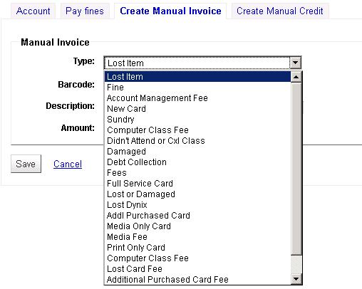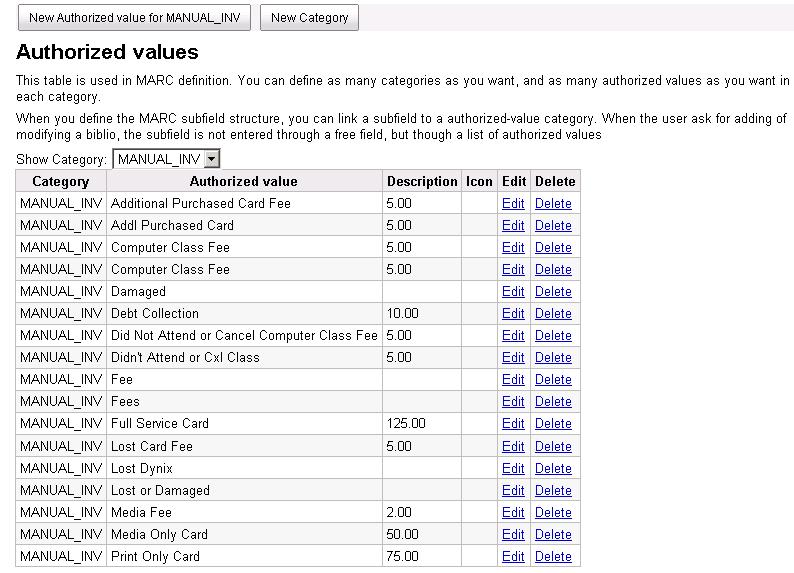 ---- Reported by jwagner@ptfs.com 2009-08-02 17:53:47 ---- Created an attachment Predefined fee setup screenshot Sponsored by East Brunswick Public Library, East Brunswick, NJ, USA. Add ability to have list of predefined fee types and amounts when creating a manual invoice (e.g., lost card fee, training class, etc.). To use create authorised values with the category MANUAL_INV. Authorized Value is the description, and Description is the default fee (if any) rather than the reverse, because the authorised_values table requires the values to be unique. The code under creating a manual invoice adds these to the pulldown list, and swaps the fee/description to the proper place. Patch sent July 25, 2009. ---- Additional Comments From jwagner@ptfs.com 2009-08-02 17:54:17 ---- Created an attachment Predefined fee use screenshot --- Bug imported by chris@bigballofwax.co.nz 2010-05-21 01:11 UTC --- This bug was previously known as _bug_ 3476 at http://bugs.koha.org/cgi-bin/bugzilla3/show_bug.cgi?id=3476 Imported an attachment (id=1340) Imported an attachment (id=1341) Unknown operating system Windows 2000. Setting to default OS "All". Actual time not defined. Setting to 0.0 The original reporter of this bug does not have an account here. Reassigning to the person who moved it here: chris@bigballofwax.co.nz. Previous reporter was jwagner@ptfs.com. The original assignee of this bug does not have an account here. Reassigning to the default assignee for the component, gmcharlt@gmail.com. Previous assignee was kohaprogrammers@ptfs.com. CC member bchurch@ptfs.com does not have an account here The original submitter of attachment 1340 [details] is unknown. Reassigning to the person who moved it here: chris@bigballofwax.co.nz. The original submitter of attachment 1341 [details] is unknown. Reassigning to the person who moved it here: chris@bigballofwax.co.nz.