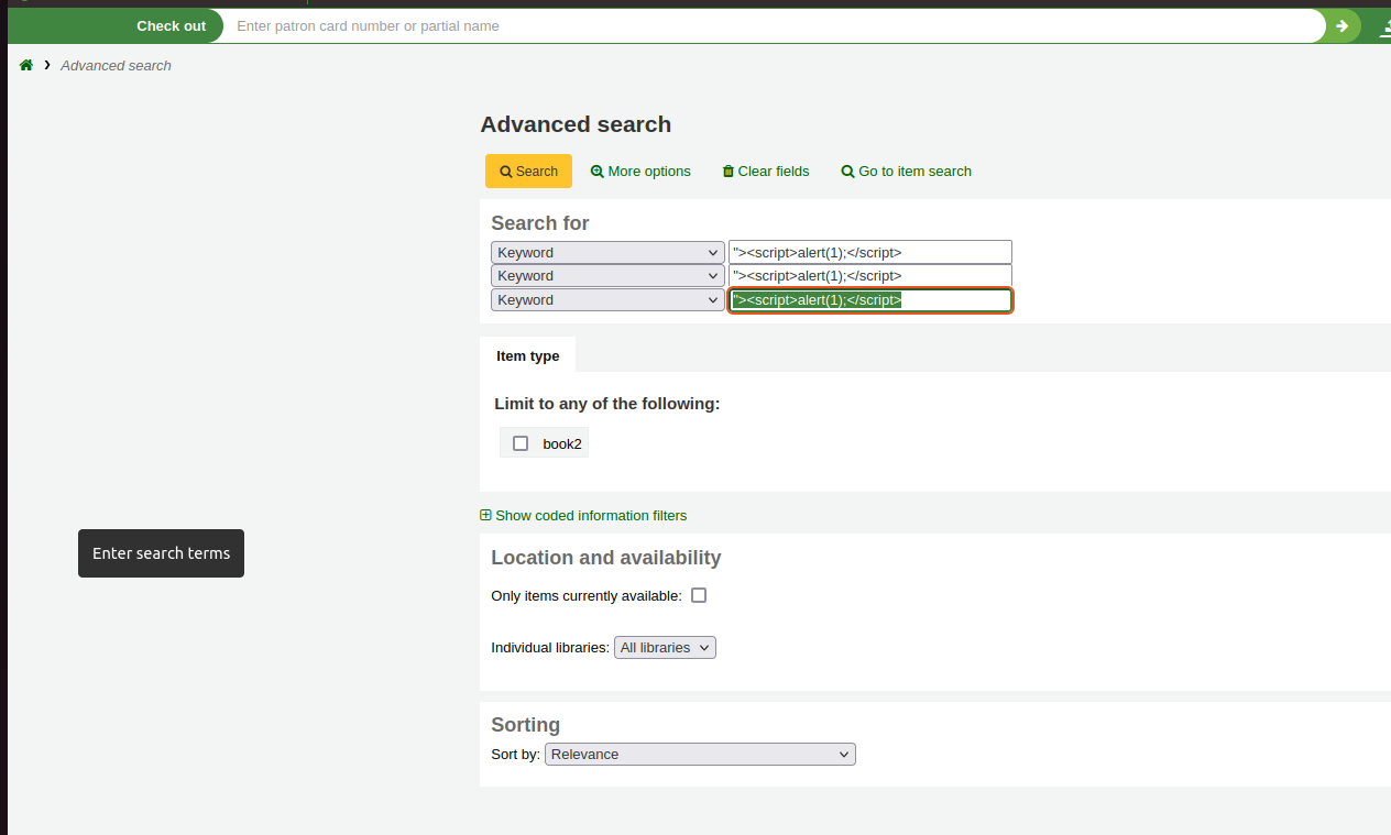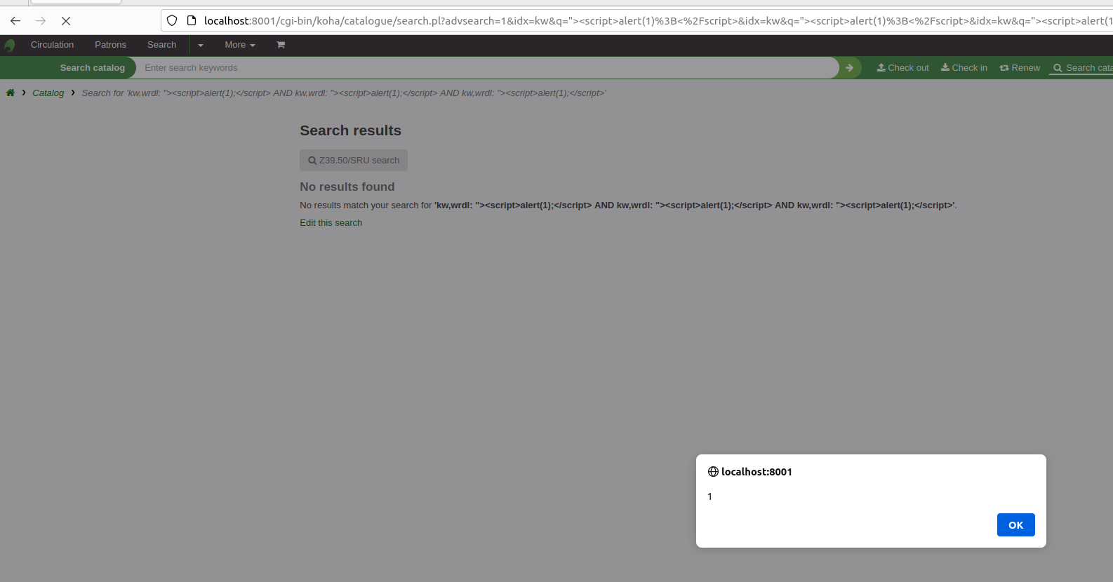Created attachment 155527 [details] XSS PoC Hello, how are you? I come back and make the report for the XSS vulnerability reflected in koha marc21 and koha unimarc There is a vulnerability in the advanced search component once authenticated, the vulnerability is exploited in the same way in both software, the vulnerability is for the latest version "23.05.03" the ones to reproduce it are these - First we log in to the platform, using the credentials that we configured during the installation. - then we go to an advanced configuration, the endpoint is this "http://localhost:8001/cgi-bin/koha/catalogue/search.pl" - See there in each of the checkpoints of the advanced search we place our payload - our payload is "><script>alert(1);</script> and with this we get the xss reflected Below I attach a screenshot of how the PoC is done