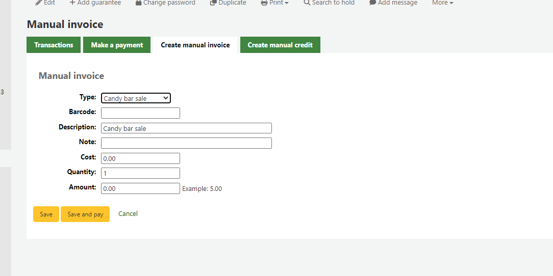 Created attachment 156561 [details] [review] Bug 34985: Add a quantity field to the manual invoice form This patch add a Quantity field and a Cost field to the manual invoice form this will allow to automatically multiply the amount when it has a default amount. Test plan: 1) Apply the patch 2) Create multiple charge types some with default amount and some without default amount 1-1) Go to Administraion -> Debit types 1-2) Click on New Debit types 1-3) Fill the form check the "Can be manually invoiced?" field 1-5) Click on save 3) Create a manual invoice 2-1) Find a patrons 2-2) Click on Accounting tab 2-3) Click on Create manual invoice tab 2-4) Select a type with default amount set ->Cost field and Quantity field should be added to the form 2-5) Edit the Cost field or Quantity field ->The amount will be automatically calculate 2-6) Select a type with no default amount set ->Cost field and Quantity field should not be added to the form Signed-off-by: Kristi Krueger <kkrueger@cuyahogalibrary.org>