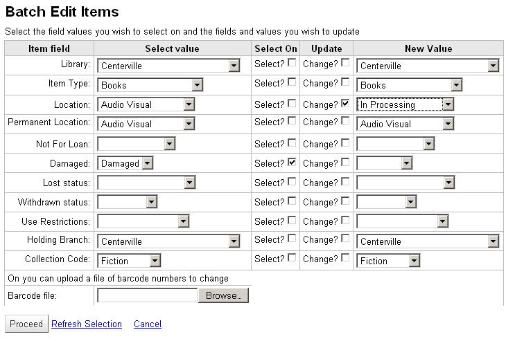 ---- Reported by jwagner@ptfs.com 2009-08-05 18:56:46 ---- Created an attachment Batch item edit screenshot Sponsored by East Brunswick Public Library, East Brunswick, NJ, USA and Middletown Township Public Library, Middletown, NJ, USA. Enhancement to allow batch changes on data elements in the item records. Select by various settings including item type, collection code, lost/damaged status, library. Change those or other settings on the matching records (you can select on one setting and modify a different one). For example, select all items with status of Damaged and change location to In Processing. You can also upload a file of barcodes and change desired settings. Requires granular permission in another enhancement ( http://bugs.koha.org/cgi-bin/bugzilla3/show_bug.cgi?id=3500 ). ---- Additional Comments From jwagner@ptfs.com 2010-05-12 12:55:56 ---- The fix for this bug (in ptfs-harley) can be pulled from the public git repository at http://github.com/Koha-PTFS, branch http://bugs.koha.org/cgi-bin/bugzilla3/show_bug.cgi?id=3509 Note: parallel development by BibLibre is already in head; will need to reconcile. --- Bug imported by chris@bigballofwax.co.nz 2010-05-21 01:11 UTC --- This bug was previously known as _bug_ 3509 at http://bugs.koha.org/cgi-bin/bugzilla3/show_bug.cgi?id=3509 Imported an attachment (id=1375) Unknown operating system Windows 2000. Setting to default OS "All". Actual time not defined. Setting to 0.0 The original reporter of this bug does not have an account here. Reassigning to the person who moved it here: chris@bigballofwax.co.nz. Previous reporter was jwagner@ptfs.com. The original assignee of this bug does not have an account here. Reassigning to the default assignee for the component, gmcharlt@gmail.com. Previous assignee was kohaprogrammers@ptfs.com. Bug reassigned, setting status to "NEW". Previous status was "ASSIGNED". The original submitter of attachment 1375 [details] is unknown. Reassigning to the person who moved it here: chris@bigballofwax.co.nz.