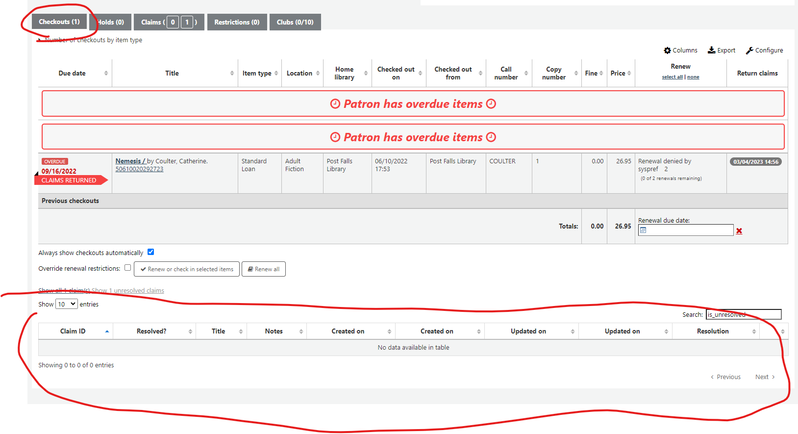 Created attachment 157483 [details] [review] Bug 35112: Fix return claims table showing on other patron tabs This patch fixes some unintentional changes introduced by Bug 25023. To test: 1. Set a LOST authorised value in the ClaimReturnedLostValue to enable return claims. 2. Check out an item 3. Submit a return claim for the checkout 4. Refresh the patron page 5. Notice the return claims table is showing strangely when viewing the other patron tabs i.e. Checkouts, Holds, Restrictions. 6. Apply the patch and refresh the page 7. Confirm the return claims table only shows when viewing the Claims tab, as expected. Sponsored-by: Pymble Ladies' College