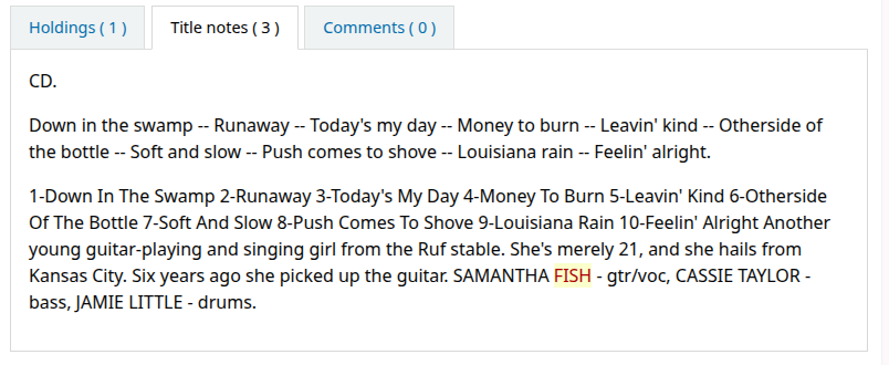 It would be nice if Koha could highlight the search term in the title notes tab of a OPAC biblio detail page.