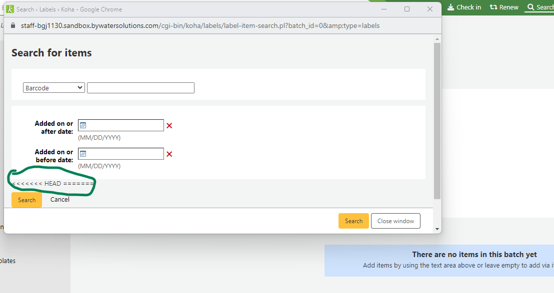 Created attachment 161499 [details] [review] Bug 35349: Reindent label item search template This patch reindents the label item search template so that it has consistent indentation. These changes should have no visible effect on the page. To test, apply the patch and go to Cataloging -> Label creator. - Click New -> Label batch. - Click the "Add items" button under the form. - A "Search for items" window should pop up. - The form should look correct, and work as it did before the patch. Viewing the diff while ignoring whitespace changes should show only places where a line break was added. Signed-off-by: Barbara Johnson <barbara.johnson@bedfordtx.gov> Signed-off-by: Martin Renvoize <martin.renvoize@ptfs-europe.com>