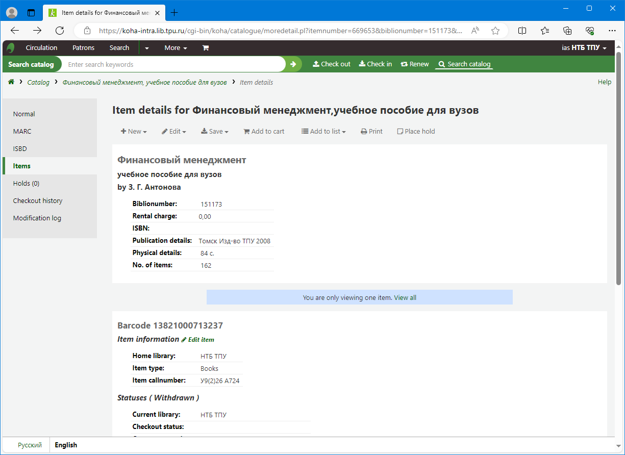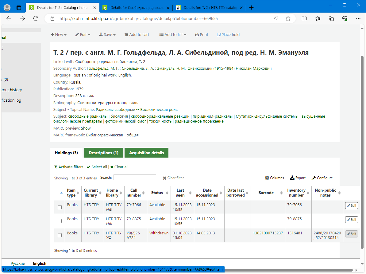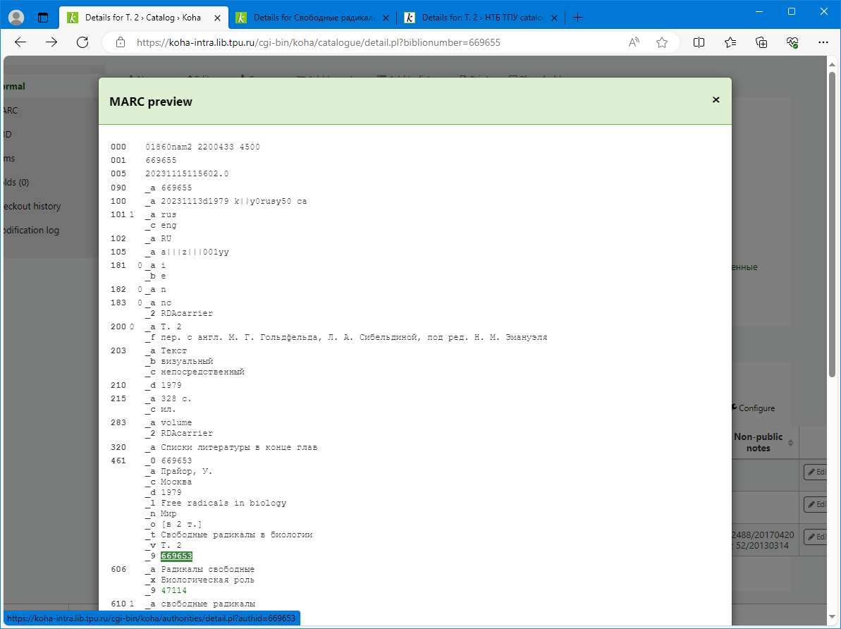 OPAC https://koha.lib.tpu.ru/cgi-bin/koha/opac-detail.pl?biblionumber=669655