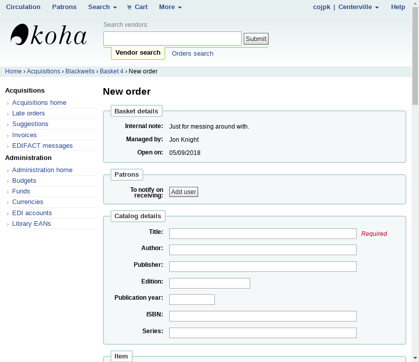 Created attachment 75210 [details] Screen grab of the "From a new (empty) record" option for add order to basket. I'm _assuming_ its the page shown in the attached screen shot, which you can get to from an open basket by clicking on the "+ Add to basket" button, then selecting the "From a new (empty) record" option in the choice list. The "Catalog details" section in that page includes an ISBN, but not an ISSN. Thus you can order a monograph, but not a single serial (as opposed to a serial subscription, which is a separate option). Interesting selecting "From an external source" does give you a form that includes both ISBN and ISSN.
