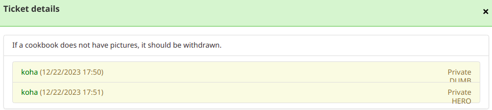 Going to pass QA with some remarks (no blockers for me): FAIL installer/data/mysql/atomicupdate/bug_35628.pl FAIL file permissions File must have the exec flag WARN tidiness The file is less tidy than before (bad/messy lines before: 0, now: 11) WARN t/db_dependent/api/v1/ticket_updates.t WARN tidiness The file is less tidy than before (bad/messy lines before: 57, now: 58) COMPARE + status: + type: + - string + - "null" + description: Current status of the ticket + readOnly: true WITH + status: + type: + - string + - "null" + description: Status of the ticket after this update => The first is readonly, the second is not. Just noting. + # Update ticket status if needed + if ( $ticket_update->{status} ) { + my $ticket = $update->ticket; + $ticket->set( { status => $ticket_update->{status} } )->store; + } Reading this the first time without deeper knowledge of the feature, these are quite confusing variable names. $update ? js if (o["!="] === '[% st.authorised_value | html %]') { additional_filters.status.push({ '!=': "[% st.authorised_value | html %]" }); No blocker. But using != here like this creates obscure code. General: Lots of patches here have no specific test plan. When I want to add a concern, it is hard to find how to. Not intuitive. Under the Concerns tab I should be able to add a new one.. (It is under New menu.) Updating status with custom ones is confusing. Display of the custom status on Ticket update looks suboptimal. If it is the intention to change the main status, the feature does not work as expected? Please improve on new follow-up reports?
