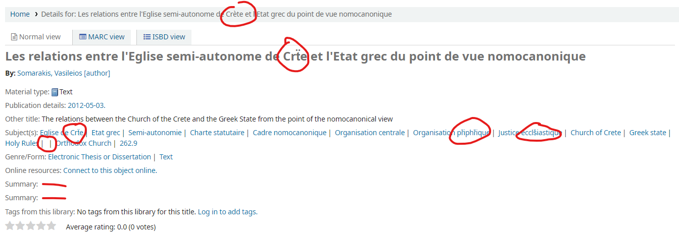 Just wanted to point out that I tried to harvest bibliographic records from the first repository suggested in the Test plan (http://staroai.theses.fr/OAIHandler, oai_dc data format) in a MARC21 Koha instance (therefore using OAIDCtoMARC21XML.xsl to transform the records prior to importing), and when I ran the OAI harvester script in verbose mode I got many lines similar to the following in the output: no mapping found for [0xC9] at position 0 in Économie politique g0=ASCII_DEFAULT g1=EXTENDED_LATIN at /usr/share/perl5/MARC/Charset.pm line 308. no mapping found for [0xC9] at position 0 in Église et société g0=ASCII_DEFAULT g1=EXTENDED_LATIN at /usr/share/perl5/MARC/Charset.pm line 308. The script did actually finish and managed to add 91 records, but I noticed that in the biblio details page in the OPAC some (not all) words containing accented characters did not appear correctly. I have uploaded a screenshot that illustrates this. Upon further investigation, it looks like the script *does* manage to populate database fields such as biblio.title and biblio.abstract with the correctly accented characters, but some MARC fields (such as 245 - Title, and 6xx - Subjects) in the MARCXML representation in biblio_metadata.metadata still contain weird characters wherever accents exist. The fix is to apply Franck Theeten's solution from Bug 16488 (https://bugs.koha-community.org/bugzilla3/show_bug.cgi?id=16488#c24) and modify the value of the MARC leader's 10th character to 'a' in the XSLT. Then, the accented characters get imported properly and the records appear correctly in the OPAC.