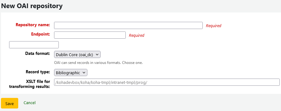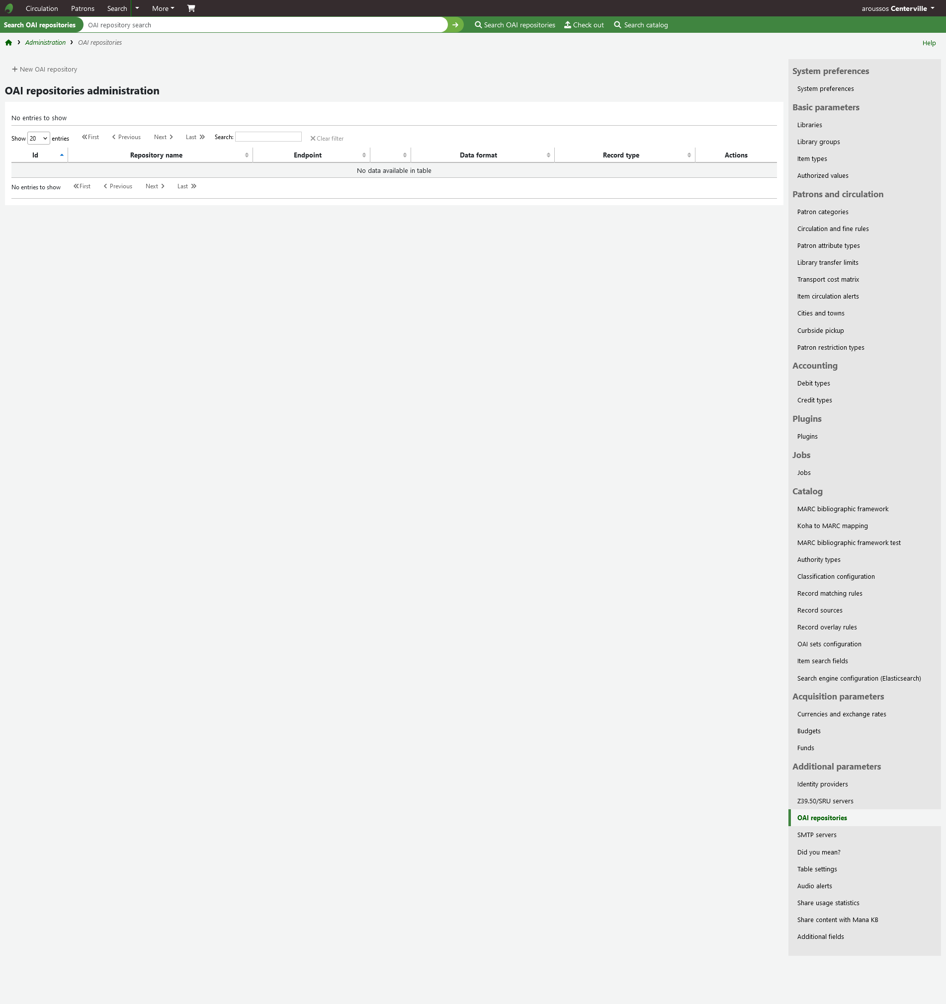Hi all, thanks for the hard work on this! 1) Position on admin start page (non blocker) Right now the OAI repositories live under "Additional parameters" instead of catalog like the OAI sets. I wonder if we should move them up since this also concerns the catalog :). If we do, let's not forget the module navigation as well. 2) Empty column heading (please follow-up) For some unknown to me reason, this doesn't appear to work as expected: <thead><tr><th>ID</th><th>Repository name</th><th>Endpoint</th><th>[% tp('OAI', 'Set') | html %]</th><th>Data format</th><th>Record type</th><th class="noExport">Actions</th> The column header for Set remains empty in my testing.