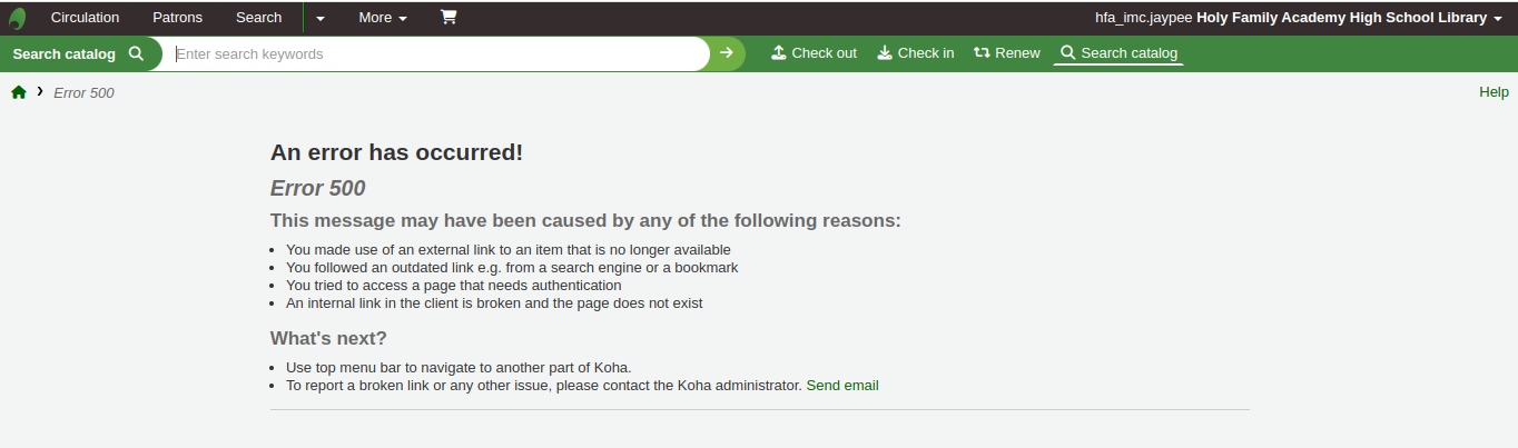 (In reply to Pradeep from comment #5) > I have checked $y, $a and $b item have all information. Also checked log. > Problem occurred after upgrade (23.11) > Now we are using Koha Offline circulation Firefox plugin to do check out. > Renew and Check in is working very well. What did you see in the log? With an error 500 there should be a more helpful error in the logs. You can see what happens during the checkout with tail -f /var/log/koha/<instance>/*.log