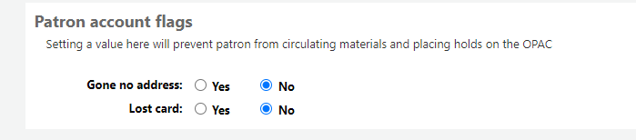 Created attachment 160547 [details] PatronAccountFlags On a patron's account page, under Library use > Patron account flags, the description above the account flags reads "Setting a value here will prevent patron from circulating materials and placing holds on the OPAC" We have found that setting the Lost card flag does not prevent a patron from placing holds. Ideally, the functionality of the flag should be updated so that holds are prevented by this flag, or the description of the flag should be updated to remove mention of holds. Having the ability to prevent patrons with a particular designation (restricted, lost, etc.) from placing holds as well as checking out or renewing would be helpful.