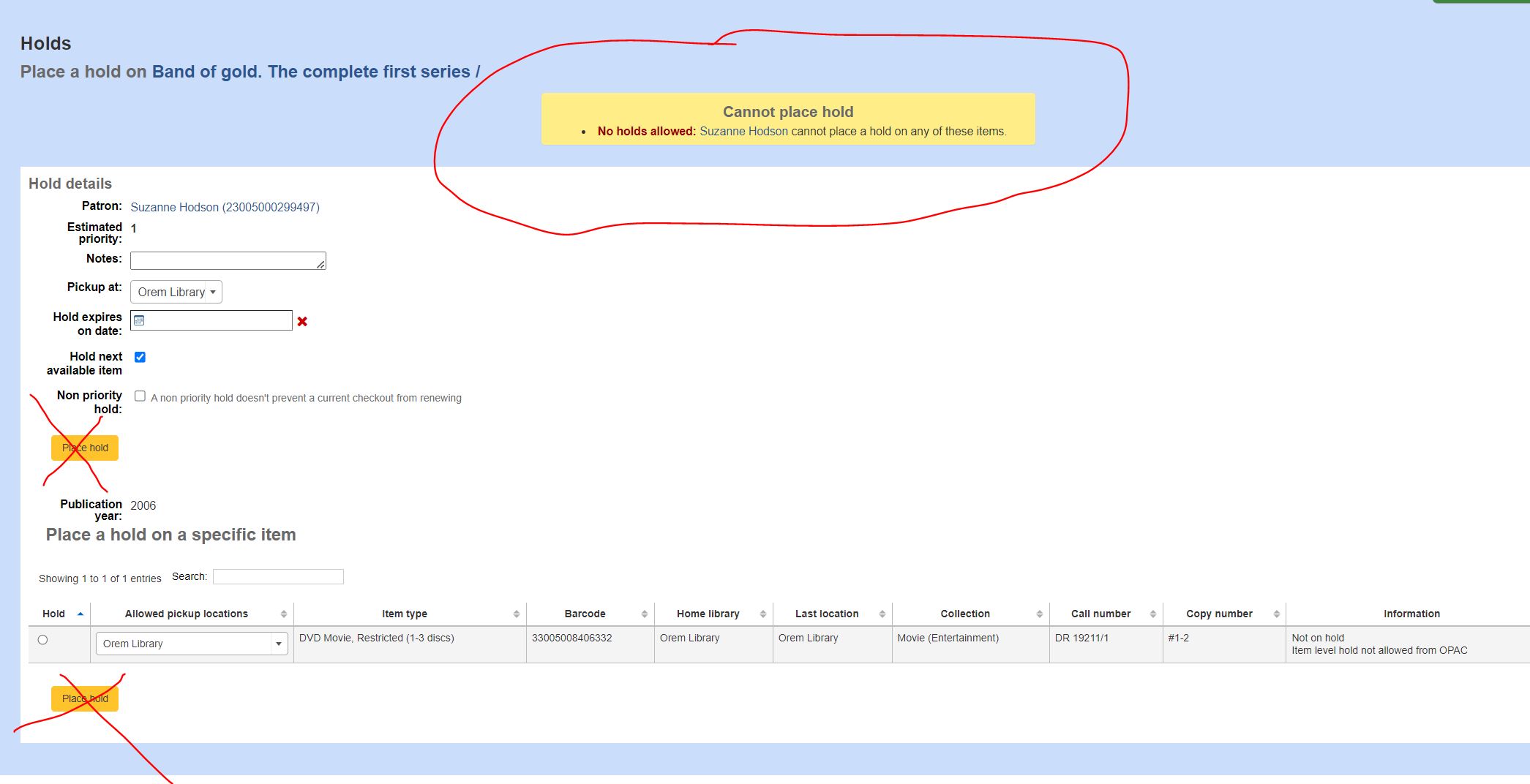Because staff can still click on "Place Hold" without seeing anything pop up in front of what they are doing, they don't always notice the pop up that says "No holds allowed." (See the attached screen shot.)