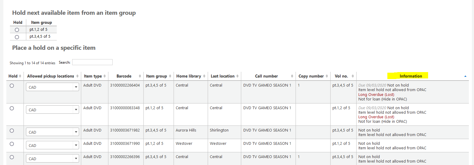 Created attachment 160996 [details] View of Item Group and Specific Item Hold Screen Item group holds table should display differently if all the items on that group are unavailable or non-holdable (withdrawn, lost, etc.). This would keep staff from accidentally placing a hold on an item group that would not fill the hold. Basing this request on information that's available under the "Information" column of the "Place a hold on a specific item" section of the place hold page.