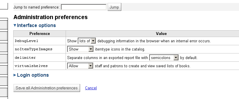 ---- Reported by oleonard@myacpl.org 2009-09-10 14:38:07 ---- Created an attachment Screenshot I propose breaking up the large multi-heading table of system prefs into multiple tables each with their own heading. Clicking the heading would collapse or expand that section. This would work to improve clarity when trying to scan through many prefs on a single page. ---- Additional Comments From oleonard@myacpl.org 2009-09-10 14:40:23 ---- Created an attachment Proposed change --- Bug imported by chris@bigballofwax.co.nz 2010-05-21 01:12 UTC --- This bug was previously known as _bug_ 3599 at http://bugs.koha.org/cgi-bin/bugzilla3/show_bug.cgi?id=3599 Imported an attachment (id=1454) Imported an attachment (id=1455) Actual time not defined. Setting to 0.0 The original submitter of attachment 1454 [details] is unknown. Reassigning to the person who moved it here: chris@bigballofwax.co.nz. The original submitter of attachment 1455 [details] [review] is unknown. Reassigning to the person who moved it here: chris@bigballofwax.co.nz.