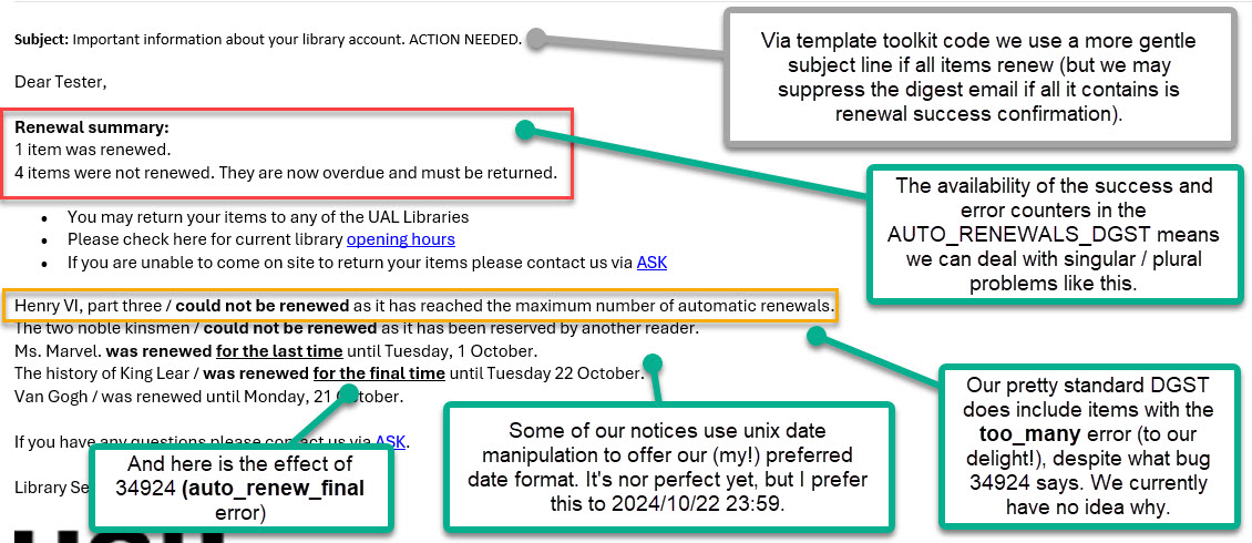 (In reply to Martin Renvoize (ashimema) from comment #2) [...] > What I'd be really interested in know is what people might like the > 'perfect' notice to include.. we have the opportunity to 'upgrade' it here.. Ah, the 'perfect notice'! We are doing lots of (relatively simple) work to improve our notices. One feature we find useful is the inclusion of the success / error counters in the AUTO_RENEWALS_DGST as it allows us to deal with singular & plural problems. We'd love to see counters available in other notices so we could use them. The screen grab of our DGST email shows how we have used the counters, and shows some other changes we have made (and exposes a puzzle that isn't relevant to the 'perfect notice' discussion).