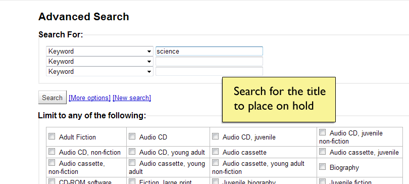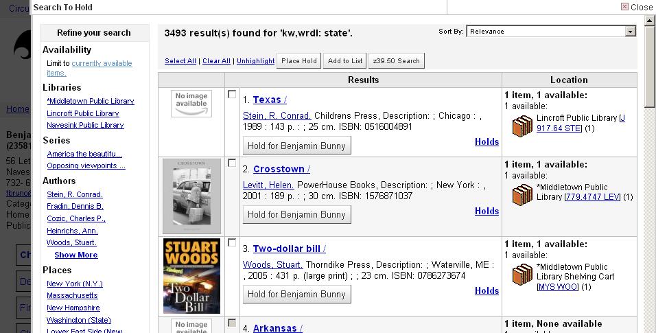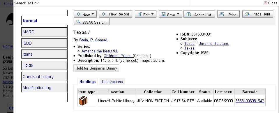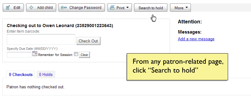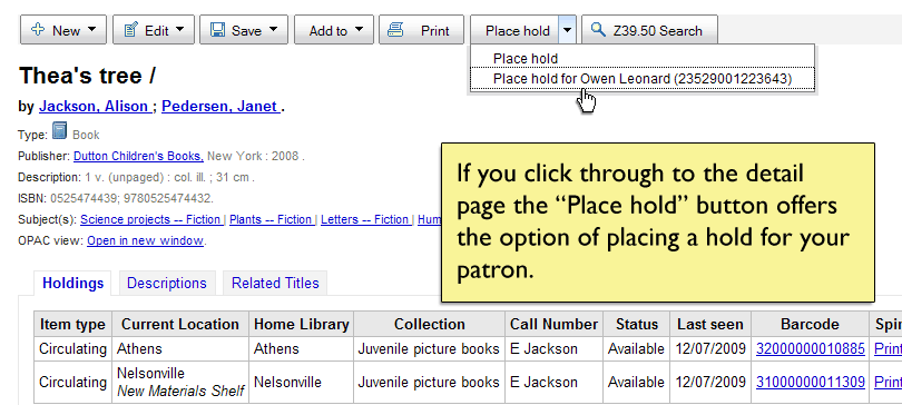 ---- Reported by jwagner@ptfs.com 2009-09-24 13:18:53 ---- Created an attachment Search to hold button on checkout tab screenshot Sponsored by Middletown Township Public Library, Middletown, NJ, USA. This feature puts a "Search to Hold" button on the patron checkout tab. Clicking that button pops up an advanced search screen on top of the patron checkout tab. Search for an item, and a "Hold for patronname" button appears in the results list on each title. You can place a hold for the current patron by clicking that button on the results list, or by going into a title from the search list and using the same "Hold for" button. ---- Additional Comments From jwagner@ptfs.com 2009-09-24 13:19:43 ---- Created an attachment Search popup with Hold For button in results list screenshot ---- Additional Comments From jwagner@ptfs.com 2009-09-24 13:20:10 ---- Created an attachment Search popup with Hold For button in title display screenshot ---- Additional Comments From oleonard@myacpl.org 2009-09-24 13:45:54 ---- I suggest adding this to the patron toolbar rather than the checkout form. ---- Additional Comments From jwagner@ptfs.com 2010-05-12 13:28:15 ---- The fix for this bug (in ptfs-harley) can be pulled from the public git repository at http://github.com/Koha-PTFS, branch http://bugs.koha.org/cgi-bin/bugzilla3/show_bug.cgi?id=3659 --- Bug imported by chris@bigballofwax.co.nz 2010-05-21 01:13 UTC --- This bug was previously known as _bug_ 3659 at http://bugs.koha.org/cgi-bin/bugzilla3/show_bug.cgi?id=3659 Imported an attachment (id=1490) Imported an attachment (id=1491) Imported an attachment (id=1492) Unknown operating system Windows 2000. Setting to default OS "All". Actual time not defined. Setting to 0.0 The original reporter of this bug does not have an account here. Reassigning to the person who moved it here: chris@bigballofwax.co.nz. Previous reporter was jwagner@ptfs.com. The original assignee of this bug does not have an account here. Reassigning to the default assignee for the component, gmcharlt@gmail.com. Previous assignee was kohaprogrammers@ptfs.com. Bug reassigned, setting status to "NEW". Previous status was "ASSIGNED". The original submitter of attachment 1490 [details] is unknown. Reassigning to the person who moved it here: chris@bigballofwax.co.nz. The original submitter of attachment 1491 [details] is unknown. Reassigning to the person who moved it here: chris@bigballofwax.co.nz. The original submitter of attachment 1492 [details] is unknown. Reassigning to the person who moved it here: chris@bigballofwax.co.nz.
