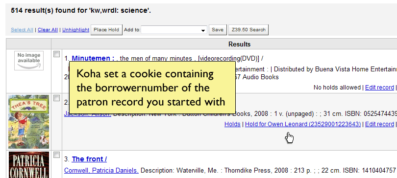 Created attachment 2976 [details] Search to hold alternative process, step 3 On the search results page Koha checks for the cookie containing a borrowernumber. If it finds one, it displays a link to place a hold for that patron.