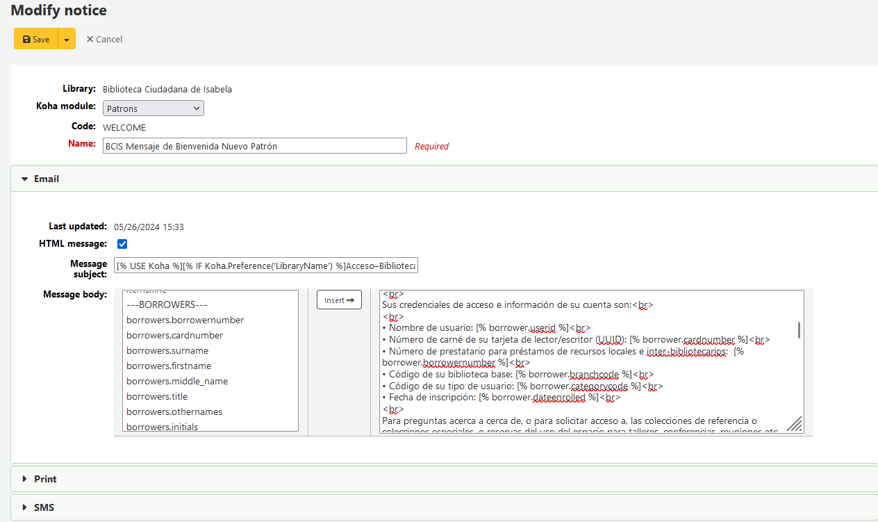 Created attachment 167183 [details] Screen capture of bug narrative. On the left, notice the object in plural. On the right, changing the object's number to singular fixes the issue. There seems to be a "typo" in the object for borrowers in the notices and slips tool [WELCOME email template for patrons). Particularly, in the ---BORROWERS--- sublist, the object is written in plural (e.g. borrowers.borrowernumber, borrowers.cardnumber, ... et seq.). However, when utilizing the borrower object.methods as listed (in plural) by "inserting it into the body", an error is not returned when saving and the email is successfully sent. But the "inserted values" do not show in the email. Only the borrower.cardnumber showed, which was one that was already written in the default. Upon closer inspection, I noteiced that the borrower object was in singular. Upon changing the object from plural to singular in the body of the edit (e.g. changing borrowers.borrowernumber to borrower.borrowernumber etc.) and rerunning the test, it executed successfully. This is the first time that I have submitted a bug report to any system. Please forgive me if I may still have to learn the ropes of how to properly do/write so. Beatitudes, ~m