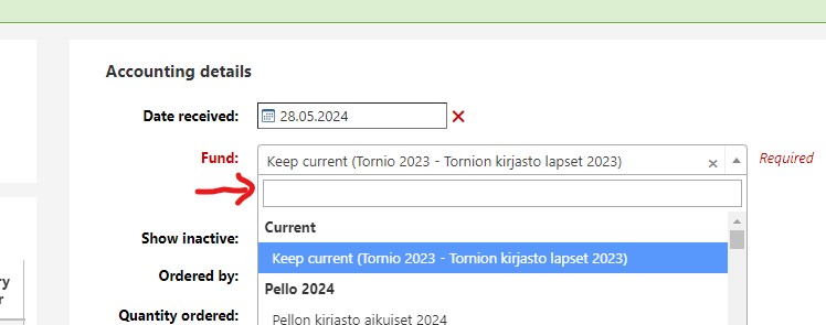 Created attachment 167219 [details] Accounting details, search box When you are receiving shipments the search box for fund doesn't work. You can choose fund from the box but you can't search it (write in the box). cgi-bin/koha/acqui/orderreceive.pl
