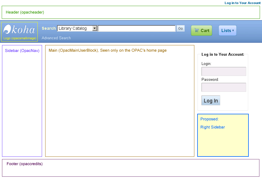 ---- Reported by oleonard@myacpl.org 2009-10-13 15:38:57 ---- Created an attachment Diagram of the proposed change Currently the area taken up by the login form on the OPAC home page cannot be customized in any way (except via CSS). I propose we add another region to the OPAC main page similar to OpacMainUserBlock: a region which will only appear on the home page. The contents of the region would appear below the login form if there were no logged-in user. If the user is logged in, the right sidebar region would move up to fill the space vacated by the login form. --- Bug imported by chris@bigballofwax.co.nz 2010-05-21 01:14 UTC --- This bug was previously known as _bug_ 3708 at http://bugs.koha.org/cgi-bin/bugzilla3/show_bug.cgi?id=3708 Imported an attachment (id=1529) Actual time not defined. Setting to 0.0 CC member biblioteca@casabalthasar.org does not have an account here The original submitter of attachment 1529 [details] is unknown. Reassigning to the person who moved it here: chris@bigballofwax.co.nz.