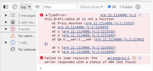 Created attachment 167887 [details] DevTool error on loading ERM Agreement table. After a new agreement is created in the ERM module, I tried to open the agreement through the E-resource management> Agreements page. However functions on this page don't seem to be working correctly. The Edit & Delete button will no response upon pressing. The agreement link in the 1st column yield a 404 error message when I click on it. When I run the browser DEVTool, I discovered the table loaded with errors. See attachment for error.
