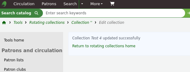 Created attachment 175066 [details] Screenshot after patch - rotating collection breadcrumbs when editing still incorrect There is still an issue with these breadcrumbs, so another bug is required to fix. For example, if I edit a breadcrumb, I get (see the screenshot attached): Tools > Rotating collections > Collection '' > Edit collection Collection Test 4 updated successfully Return to rotating collections home To replicate on main: 1. Go to Tools > Rotating collections. 2. Add a new collection (+ New collection) . Name: Test 1 . Description: anything you like 3. Results: Breadcrumb: Tools > Rotating collections > Collection created successfully Collection Test 1 added successfully Return to rotating collections home 4. From the list of rotating collections, select Actions > Edit. 5. Change the name to "Test 4". 6. Results: Tools > Rotating collections > Collection '' > Edit collection Collection Test 4 updated successfully Return to rotating collections home