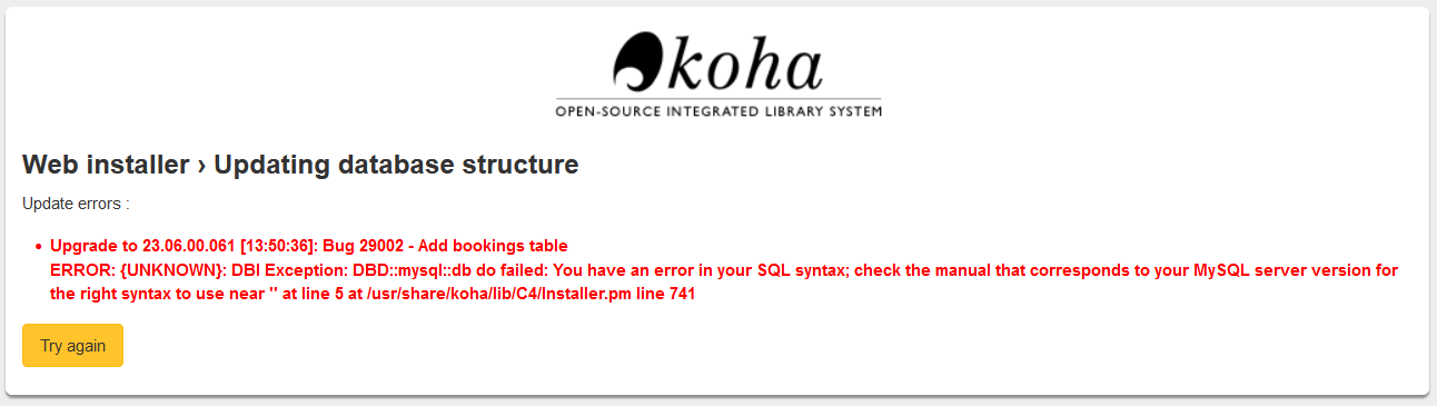Created attachment 168526 [details] Error Web installer › Updating database structure Update errors : Upgrade to 23.06.00.061 [13:50:36]: Bug 29002 - Add bookings table ERROR: {UNKNOWN}: DBI Exception: DBD::mysql::db do failed: You have an error in your SQL syntax; check the manual that corresponds to your MySQL server version for the right syntax to use near '' at line 5 at /usr/share/koha/lib/C4/Installer.pm line 741