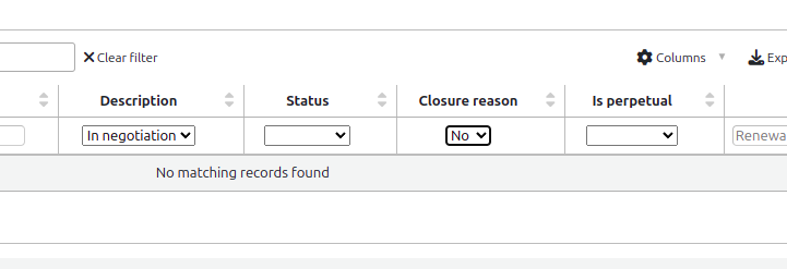 (In reply to Pedro Amorim from comment #11) > Created attachment 178507 [details] > filters out of sync > > This has caused the filters to become out of sync in agreements, and likely > licenses too, haven't tested. Look at picture, the values for the > "Description" filter are the "Status" ones, etc. > > filters_options inside tableOptions needs to be adjusted accordingly. Last patch fixes this.