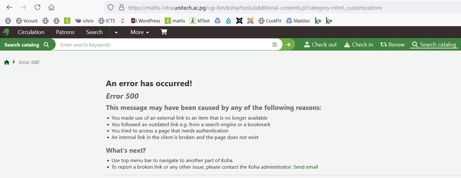Created attachment 169071 [details] Error Server was upgraded to 24.05.01 and it started showing Error 500 in Tools>HTML customizations option. In the browser console it shows Internal Server Error; GET https://matlis-intra.unitech.ac.pg/cgi-bin/koha/tools/additional-contents.pl?category=html_customizations 500 (Internal Server Error)Understand this error jquery-migrate-3.3.2.min_24.0501000.js:2 JQMIGRATE: Migrate is installed, version 3.3.2 chext_driver.js:500 Initialized driver at: Wed Jul 17 2024 10:34:22 GMT+1000 (Papua New Guinea Time) chext_loader.js:66 Initialized chextloader at: 1721176462708 Any clue how to resolve it.