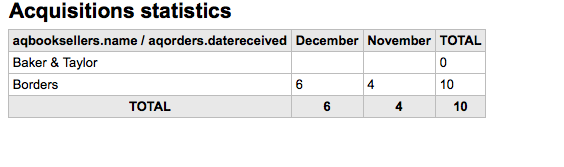 ---- Reported by nahuel.angelinetti@biblibre.com 2009-11-02 14:52:56 ---- The ordering by month in acquisition stats is done by month name(april, january, march, ...) instead of month number(01, 02, 03, 04, ...). ---- Additional Comments From nengard@gmail.com 2009-12-18 18:13:39 ---- Created an attachment sample with wrong display --- Bug imported by chris@bigballofwax.co.nz 2010-05-21 01:14 UTC --- This bug was previously known as _bug_ 3743 at http://bugs.koha.org/cgi-bin/bugzilla3/show_bug.cgi?id=3743 Imported an attachment (id=1547) Actual time not defined. Setting to 0.0 The original submitter of attachment 1547 [details] is unknown. Reassigning to the person who moved it here: chris@bigballofwax.co.nz.