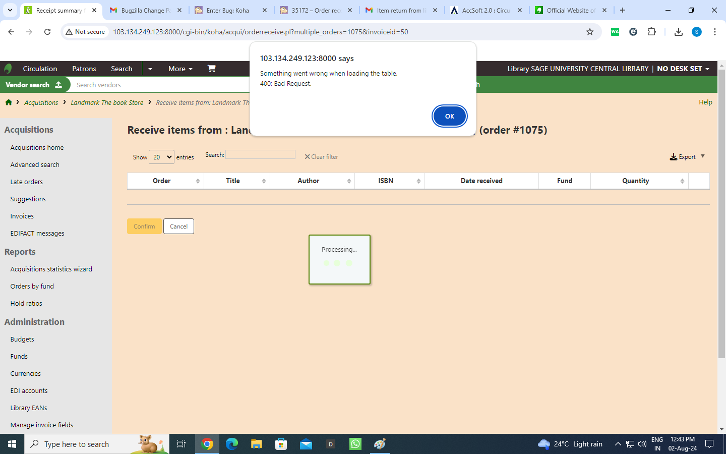 Created attachment 169986 [details] order receiving error i am upgrade koha version 23.11.06 to 23.11.07 successfully but when receiving order something went wrong when loading the table 400 internal server error please see the screen shot.