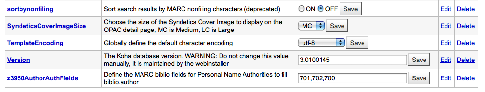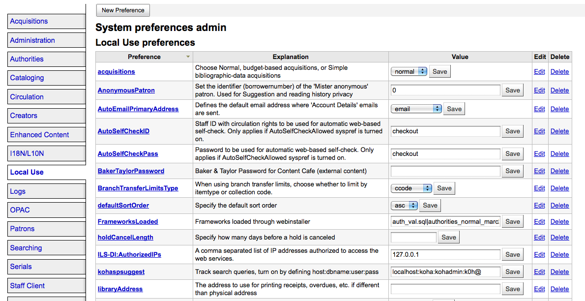 > Isn't the point of this system that librarians can manage it themselves? I > don't think that something should be left in as a reminder to developers - > instead it should be in the comments in the code - where the developers are - > not where the librarians are. I promote the power of Koha as anyone having the > ability to edit the sys prefs themselves instead of needing an expert. Also > this is the old sys prefs interface and doesn't flow with the look and feel of > the rest of it. As said Peter Parker alias Spider Man: With great power comes great responsibility. Your educated power librarians have not to be scared by their power. There are three categories of sysprefs in local tab: (1) true local syspref, (2) deprecated sysprefs and (3) false local syspref. I've send a patch to remove from local syspref tab, some sysprefs which belongs to other tabs: there were a bug. It solves (3). For (2) someone has to send a DB update to delete all deprecated syspref. You can be this person. This should be done before 3.2 as I already said. DELETE FROM systempreferences WHERE variable IN ('etc. Concerning the old syspref interface which has been resurrected for local syspref, I agree that it isn't coherent with the syspref editor but we already discussed this point on koha-devel. Something has to be done in 3.4. This has been discussed here: http://lists.koha-community.org/pipermail/koha-devel/2010-July/thread.html#34211