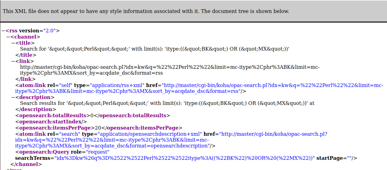 To reproduce: 1. Go to http://localhost:8080/cgi-bin/koha/opac-search.pl 2. Limit to "Books" and click "Search" 3. Click the RSS icon 4. Note the XML parsing error: This page contains the following errors: error on line 1 at column 364: EntityRef: expecting ';' Below is a rendering of the page up to the first error.